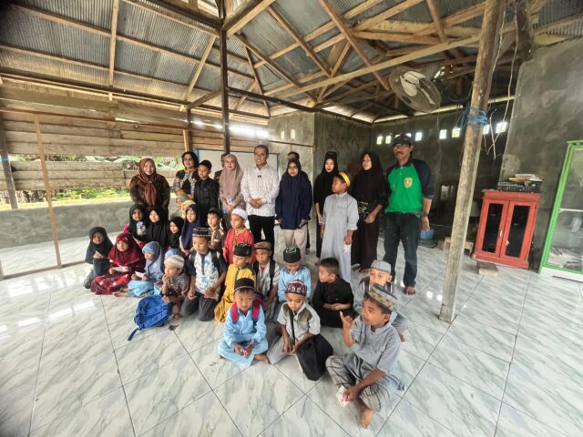 Bangunan itu adalah Musala Al-Aqsa, tempat ibadah kecil yang lebih menyerupai pondok darurat. Atapnya seng, rangkanya kayu, sebagian dinding terbuka, dan tidak ada fasilitas memadai. Namun dari celah-celah bangunan yang sederhana itu, terdengar lantunan bacaan Al-Qur’an dari anak-anak kecil. Santri cilik bersarung dan berjilbab duduk rapi di lantai, mengeja ayat demi ayat di bawah bimbingan tiga ustazah sukarela.