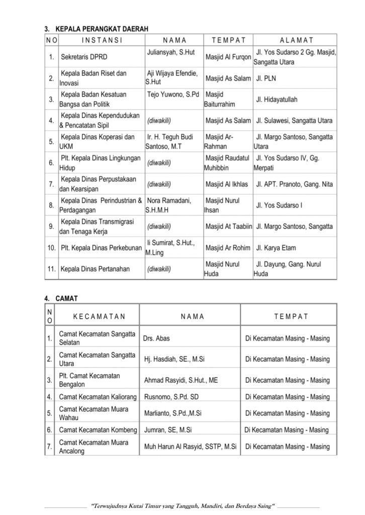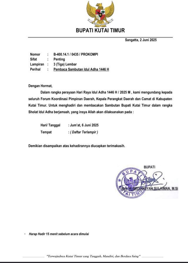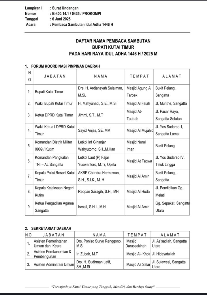 Surat undangan yang berisi daftar nama jajaran Forkopimda membacakan sambutan Bupati Kutim di Hari Raya Iduladha 1446 H.