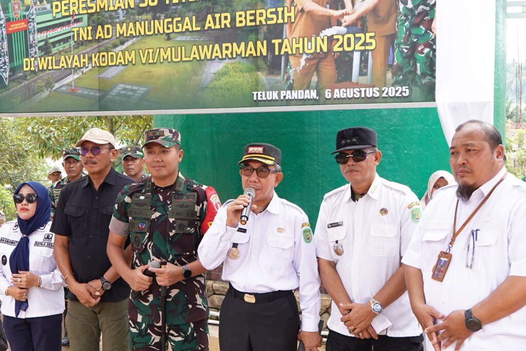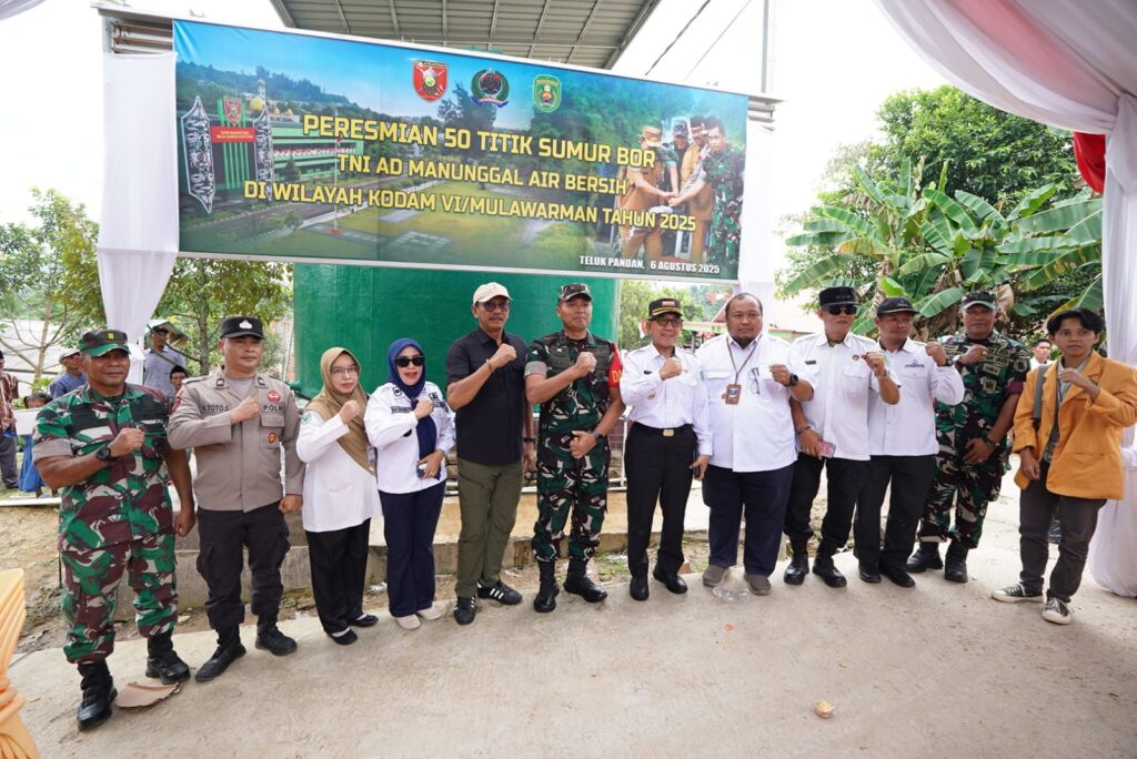 TELUK PANDAN – Kolaborasi Kodim 0909/KTM dan Pemerintah Kabupaten Kutai Timur (Pemkab Kutim) luncurkan program air bersih untuk atasi krisis dan tekan angka stunting. Di tengah terik matahari dan tanah kering di Desa Suka Rahmat, Kecamatan Teluk Pandan, menyala harapan baru. Pada Rabu, (6/8/2025), satu dari 50 titik sumur bor yang tersebar di wilayah Kodam VI/Mulawarman resmi diluncurkan secara serentak oleh Kodim 0909/KTM. Peluncuran ini menjadi bagian dari Program Manunggal Air Bersih, sebuah inisiatif strategis TNI Angkatan Darat yang menjawab dua tantangan besar di daerah. Yaitu krisis air bersih dan stunting.