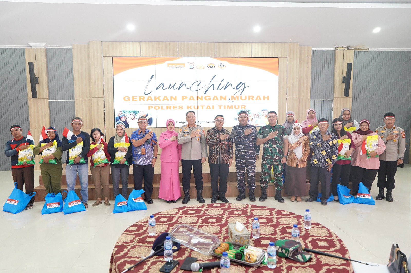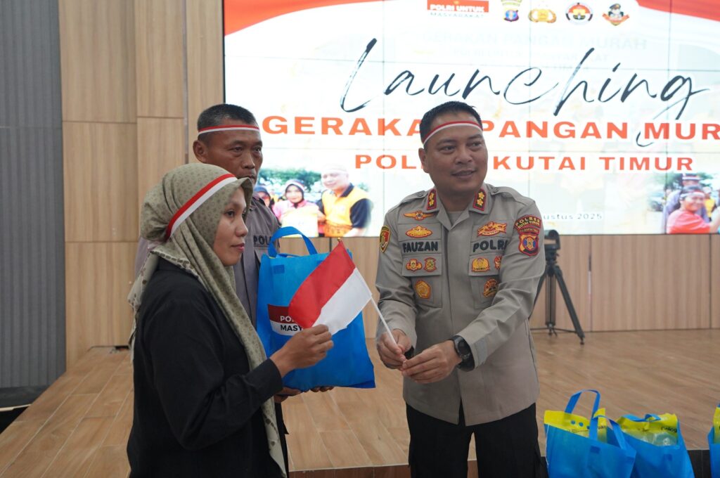 SANGATTA – Polres Kutai Timur (Kutim) menyemarakkan HUT ke-80 Republik Indonesia (RI) dengan menggelar Gerakan Pangan Murah (GPM) bagi masyarakat. Program ini tidak hanya membantu meringankan beban ekonomi warga, tetapi juga menggelorakan semangat cinta Tanah Air dengan bonus Bendera Merah Putih bagi setiap pembeli. Kegiatan ini turut dihadiri Wakil Bupati Kutim Mahyunadi bersama Forkopimda Kutim. Sebelumnya, momen ini juga sesuai arahan Kapolri Jenderal Listyo Sigit Prabowo dalam peluncuran GPM di Kompleks Bulog Kanwil DKI Jakarta lewat zoom meeting dan diikuti secara serentak oleh polda jajaran di Indonesia. GPM berlangsung di Auditorium Mapolres Kutim, Kamis (14/8/2025).