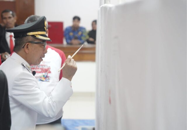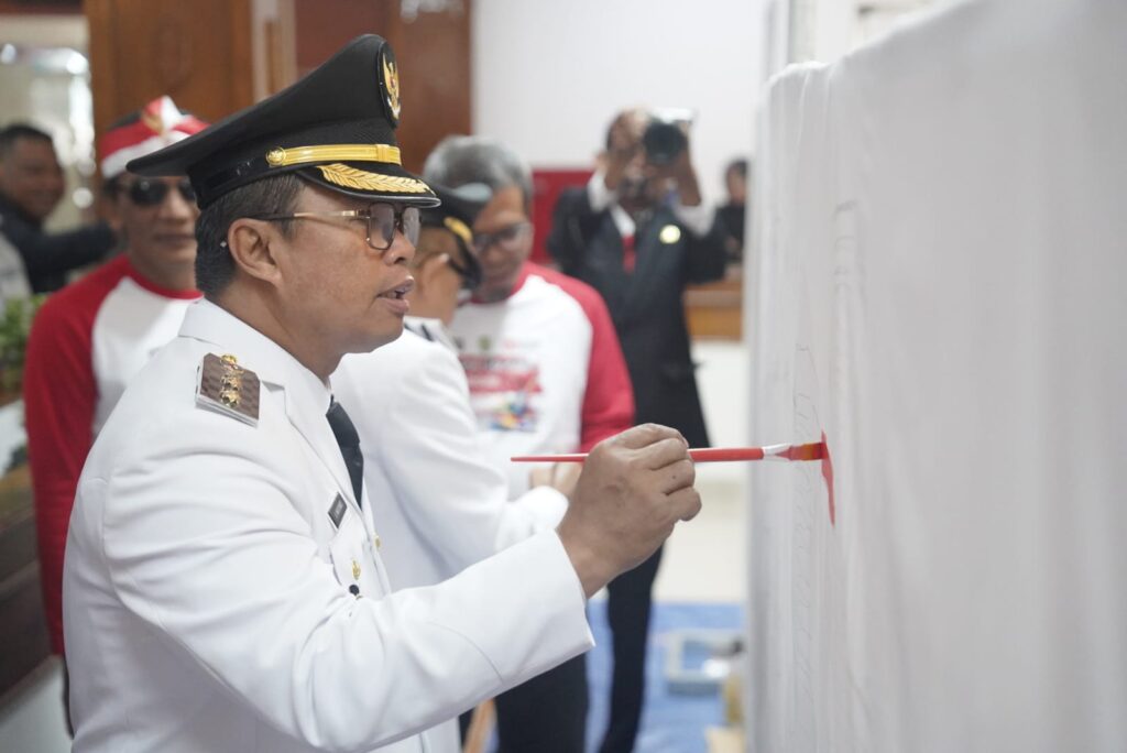 Kegiatan yang berlangsung di Lobi Kantor Bupati Kutim, Minggu (17/8) itu diawali secara simbolis oleh Bupati Kutim Ardiansyah Sulaiman, Wakil Bupati Mahyunadi bersama perwakilan jajaran Forkopimda yang turut membubuhkan kuas pertama pada bentangan kain putih tersebut.