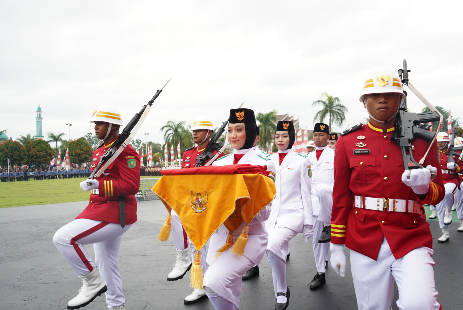 SANGATTA – Andi Vania Yus’riah Zahran menjadi sorotan utama dalam Upacara Detik-Detik Proklamasi Kemerdekaan RI ke-80 di Lapangan Kantor Bupati Kutai Timur (Kutim), Minggu (17/8/2025). Siswi SMA Negeri 1 Sangatta Utara ini dengan anggun dan penuh tanggung jawab mengemban tugas sebagai pembawa bendera pusaka.