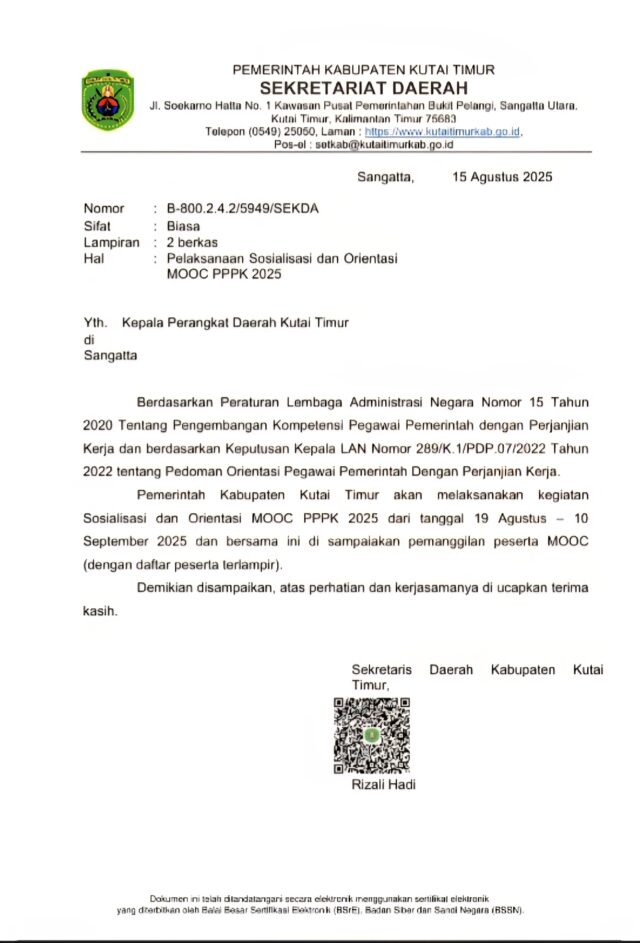 “Pemerintah Kabupaten Kutai Timur akan melaksanakan kegiatan Sosialisasi dan Orientasi MOOC PPPK 2025 dari tanggal 19 Agustus–10 September 2025, dan bersama ini disampaikan pemanggilan peserta MOOC,” tulis Rizali Hadi dalam surat resmi yang ditandatangani secara elektronik.