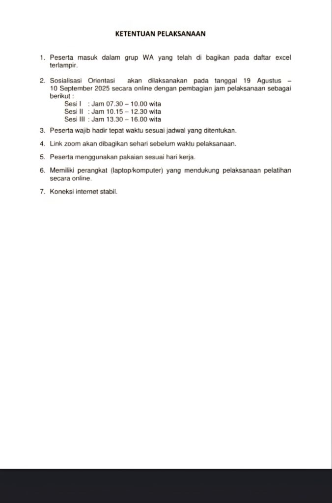 Selain itu, peserta harus memastikan koneksi internet stabil agar proses pembelajaran berjalan efektif. Informasi teknis seperti tautan Zoom akan dibagikan satu hari sebelum pelaksanaan melalui grup komunikasi resmi.