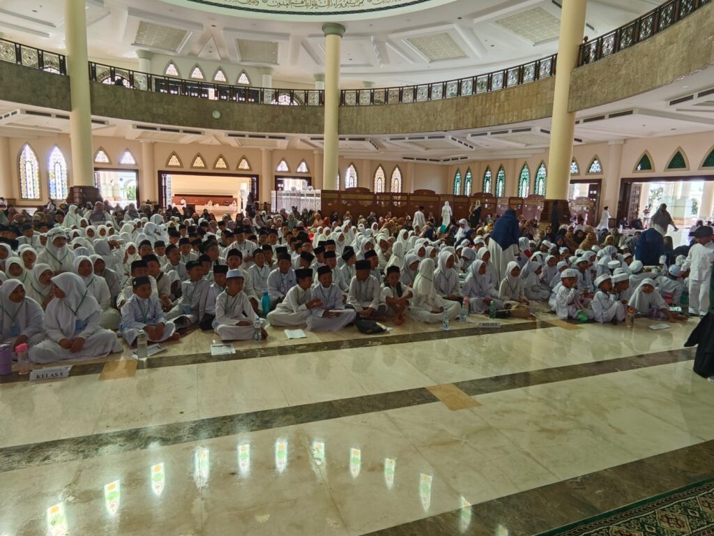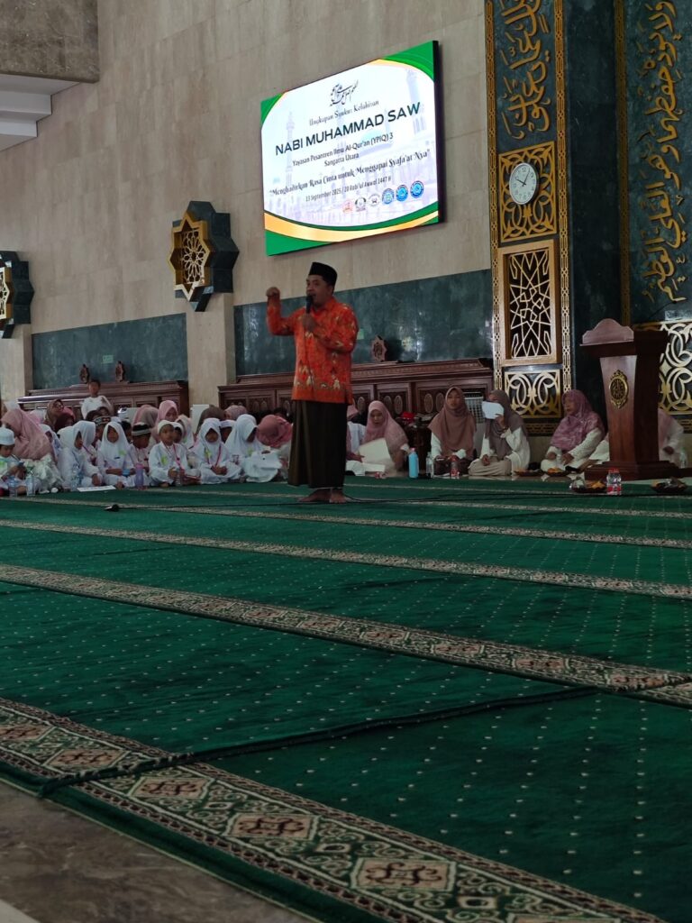SANGATTA – Sabtu (13/9/2025) pagi atau bertepatan dengan 20 Rabiul Awal 1447 Hijriah, area dalam Masjid Agung Al-Faruq Islamic Center di kawasan Pusat Perkantoran Pemerintah Kabupaten Kutai Timur (Kutim) dipenuhi para santri, jemaah, dan tokoh masyarakat. Mereka hadir untuk memperingati Maulid Nabi Muhammad SAW yang diselenggarakan oleh Yayasan Pesantren Ilmu Al-Qur’an (YPIQ) 3 Sangatta Utara. Kegiatan dimaksud mengusung tema “Menghadirkan Rasa Cinta untuk Menggapai Syafaat-Nya.”