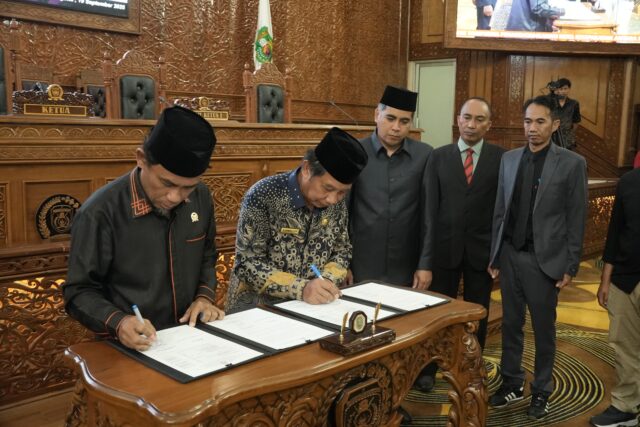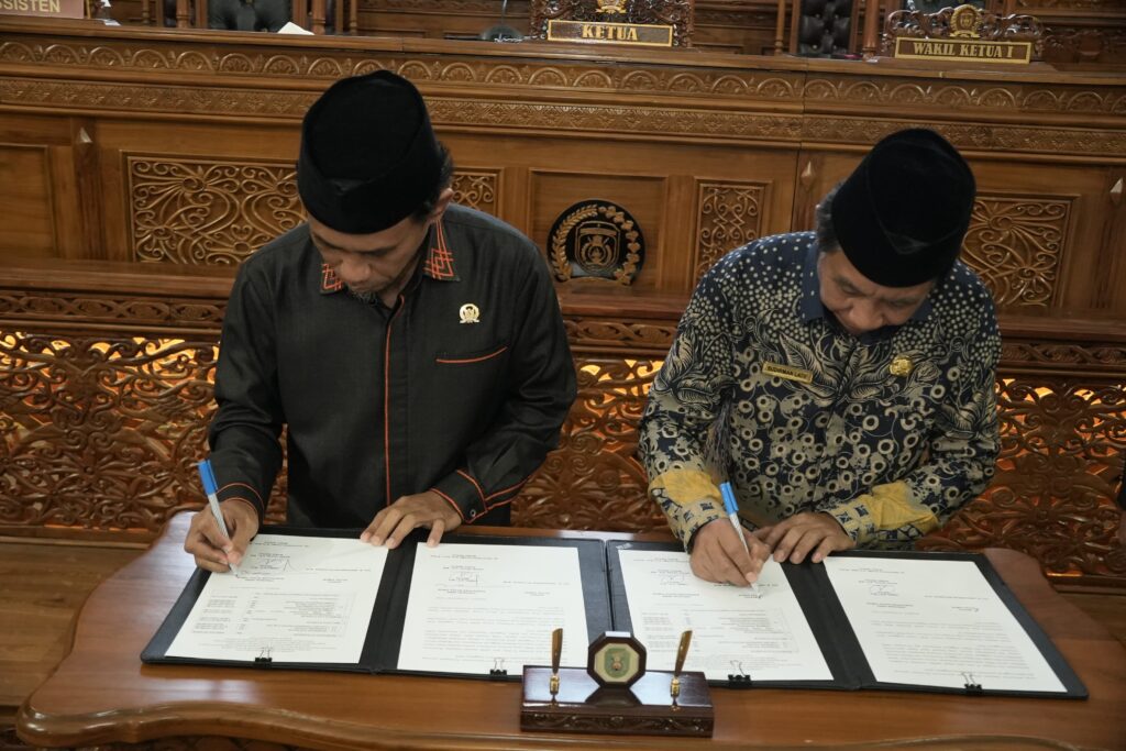 Penandatangan nota kesepakatan oleh Ketua DPRD Kutim Jimmi dan Asisten Administrasi Umum Sudirman Latif mewakili Bupati. Foto: Ricky Halmas DPRD Kutim/Miftah Pro Kutim