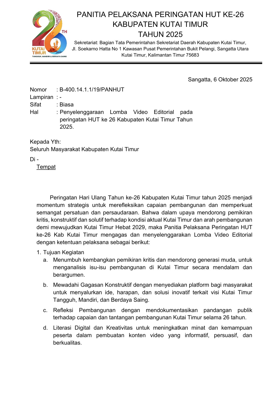 “Peringatan Hari Ulang Tahun ke-26 Kabupaten Kutai Timur tahun 2025 menjadi momentum strategis untuk merefleksikan capaian pembangunan dan memperkuat semangat persatuan dan persaudaraan,” ujar Trisno dalam surat edaran resmi tertanggal 6 Oktober 2025.