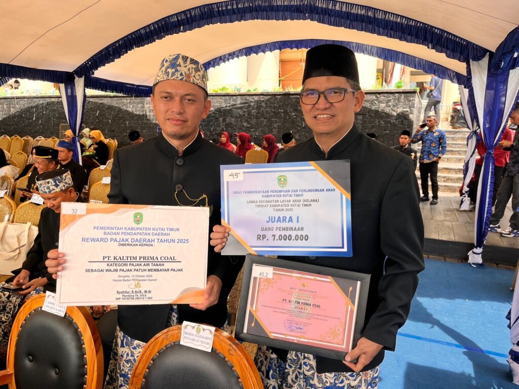 SANGATTA – PT Kaltim Prima Coal (KPC) berhasil meraih posisi pertama sebagai Perusahaan Layak Anak di Kabupaten Kutai Timur (Kutim). Penghargaan ini diserahkan oleh Dinas Pemberdayaan Perempuan dan Perlindungan Anak (DPPA) Kutim pada upacara peringatan Hari Ulang Tahun (HUT) ke-26 Kabupaten Kutim yang digelar di Lapangan Kantor Bupati Kutim, Minggu (12/10/2025).