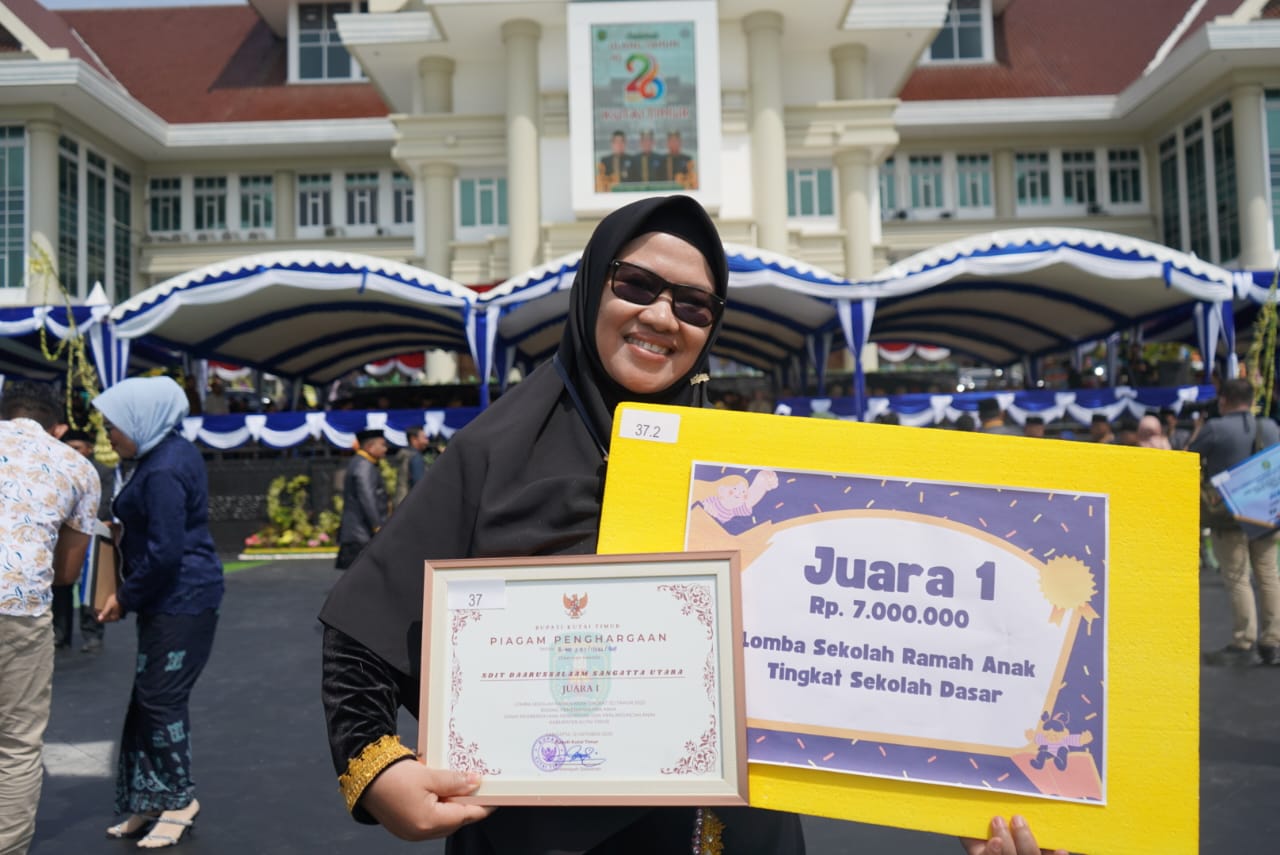 SANGATTA – Kabar membanggakan datang dari dunia pendidikan Kutai Timur (Kutim) dalam momen semarak kemeriahan Hari Ulang Tahun (HUT) ke-26 kabupaten ini. SDIT Darussalam Sangatta Utara berhasil meraih Juara 1 Lomba Sekolah Ramah Anak tingkat SD yang diselenggarakan oleh Dinas Pemberdayaan Perempuan dan Perlindungan Anak (DP3A) Kutim.