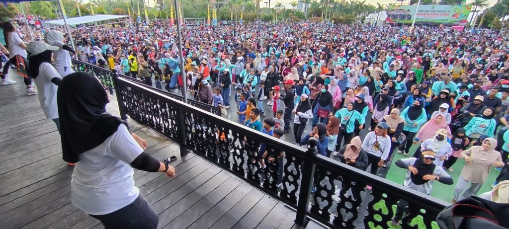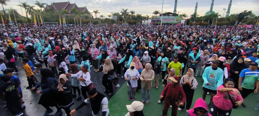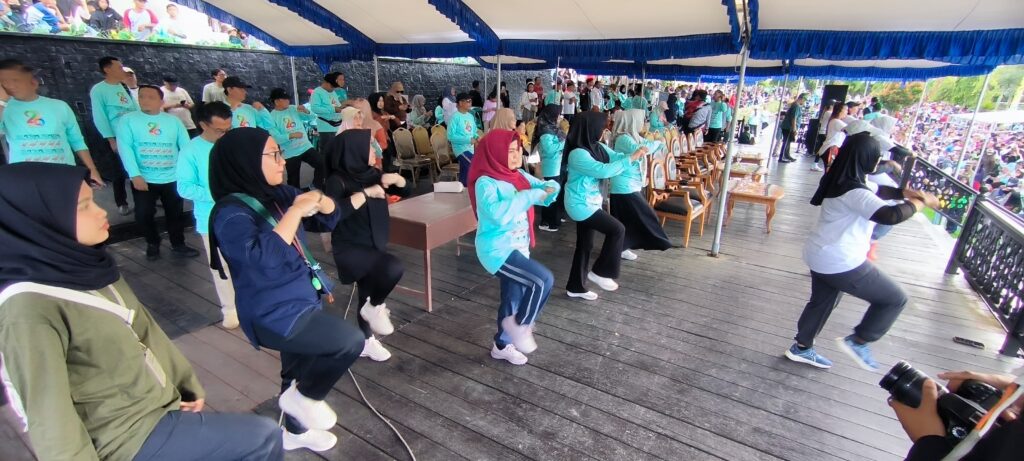 Selepas pembagian kaus, suasana pagi kian semarak dengan senam bersama. Istri Wakil Bupati Kutim Ny Hj Masriati, bersama sejumlah kepala perangkat daerah ikut bergoyang mengikuti irama, dipandu para instruktur di atas panggung. Ribuan peserta mengikuti gerakan senam dengan kompak hingga menjelang pelepasan peserta jalan sehat.