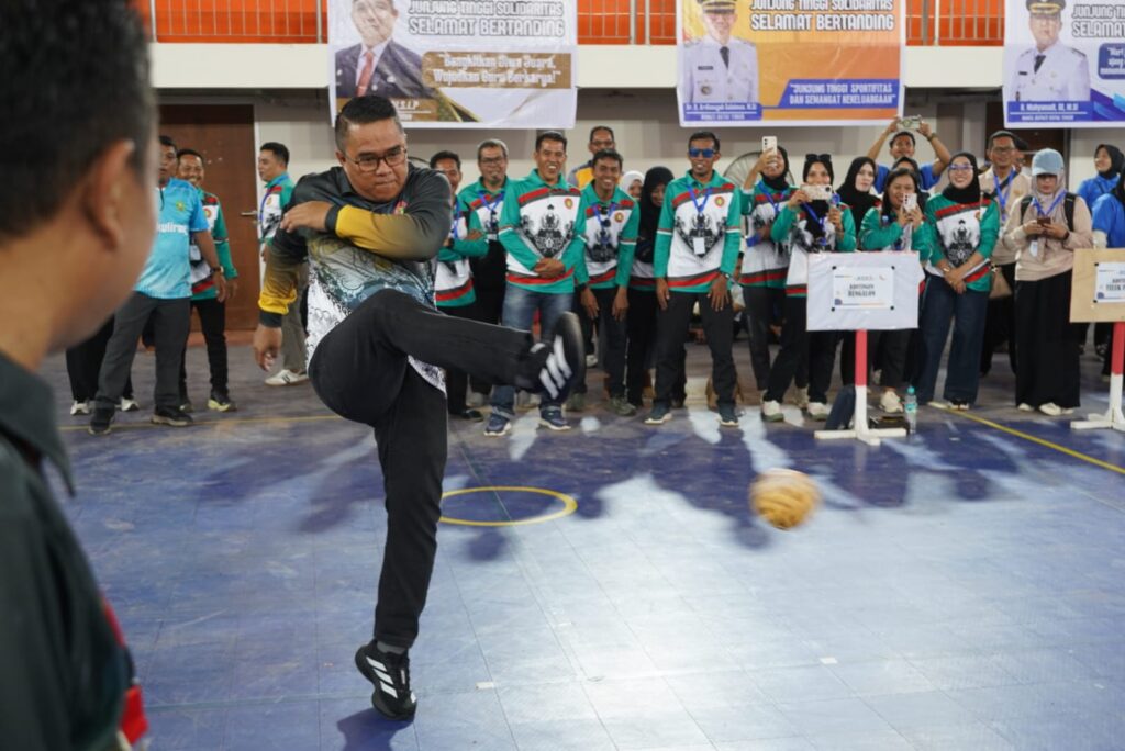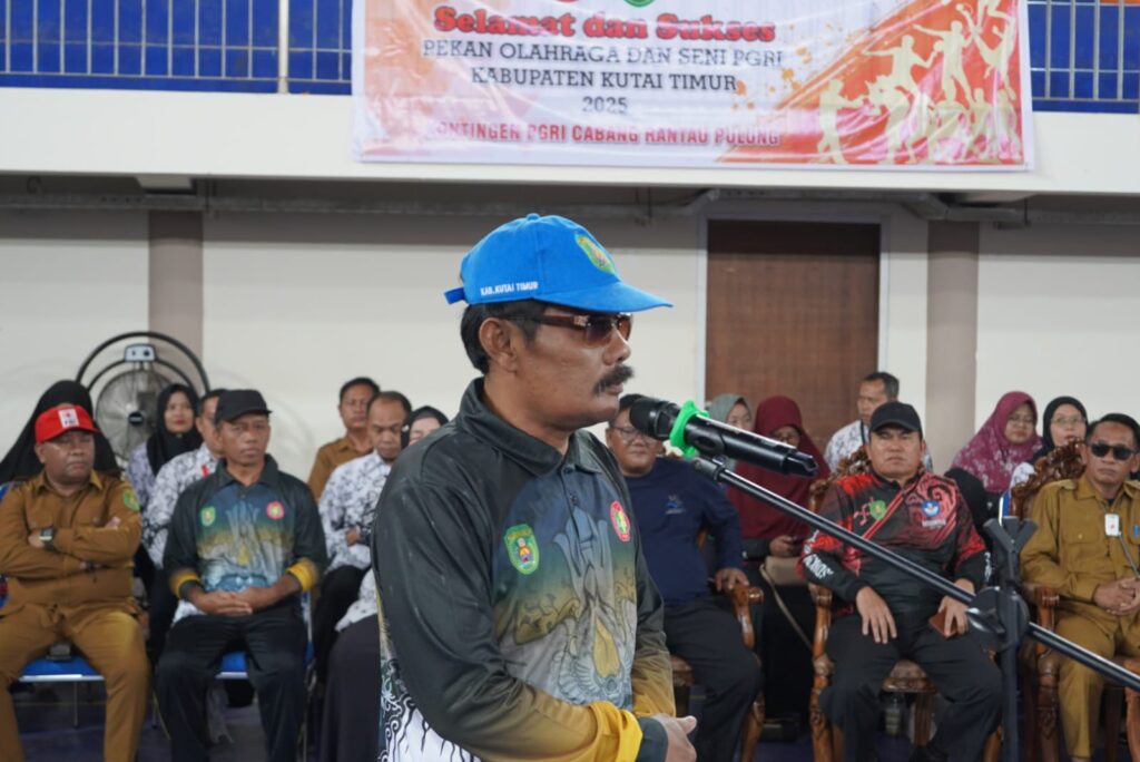SANGATTA – Suasana persaudaraan dan semangat kompetisi sehat menyelimuti Gelanggang Olahraga (GOR) Beladiri Kudungga saat Wakil Bupati Kutai Timur (Kutim), Mahyunadi membuka Pekan Olahraga dan Seni (PORSENI) Persatuan Guru Republik Indonesia (PGRI se-Kutim Tahun 2025 dengan menendang bola sepak takraw, Senin (27/10/2025) pagi.