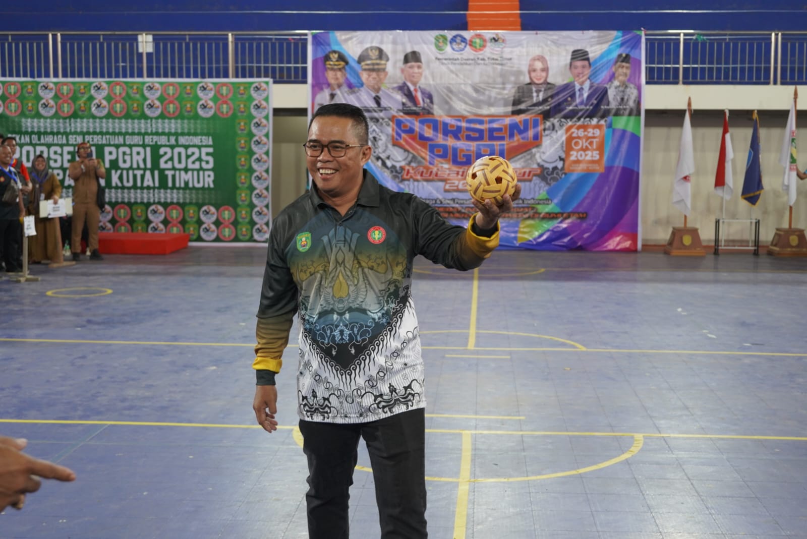 SANGATTA – Suasana persaudaraan dan semangat kompetisi sehat menyelimuti Gelanggang Olahraga (GOR) Beladiri Kudungga saat Wakil Bupati Kutai Timur (Kutim), Mahyunadi membuka Pekan Olahraga dan Seni (PORSENI) Persatuan Guru Republik Indonesia (PGRI se-Kutim Tahun 2025 dengan menendang bola sepak takraw, Senin (27/10/2025) pagi.