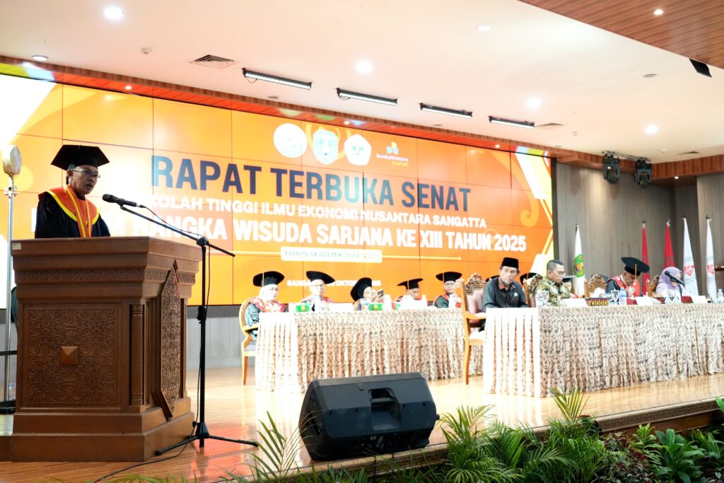 SANGATTA – Pagi itu, Kamis (30/10/2025), langit Bukit Pelangi tampak cerah. Dari kejauhan, arus kendaraan mengalir menuju Gedung Serba Guna (GSG) Bukit Pelangi. Di dalam Ruang Akasia, ratusan wajah berbalut toga tampak tegang namun bahagia. Rapat Terbuka Senat Wisuda XIII Sekolah Tinggi Ilmu Ekonomi Nusantara (STIENUS) Sangatta berlangsung khidmat. Sebuah puncak perjalanan panjang bagi para mahasiswa yang menamatkan studinya.
