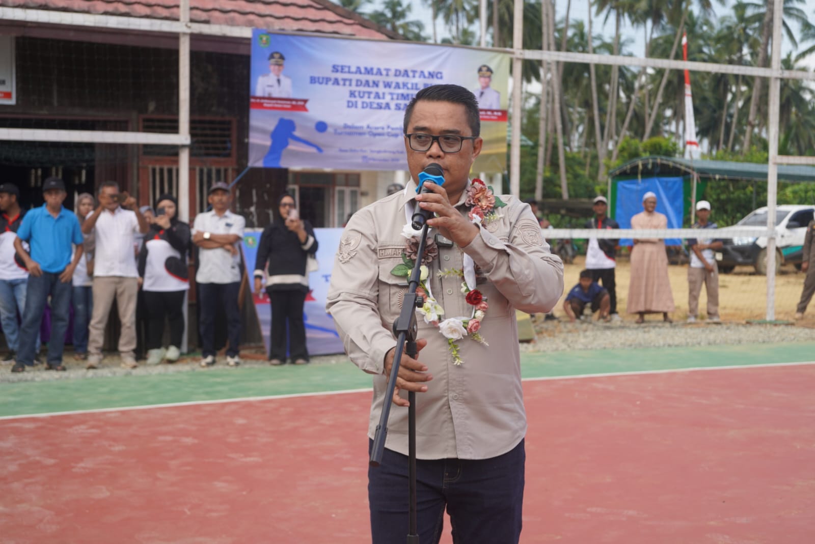 Wakil Bupati Kutim Mahyunadi saat memberikan arahan di Turnamen Bila Voli Cup 1 di Desa Saka. Foto: Bagus/Pro Kutim