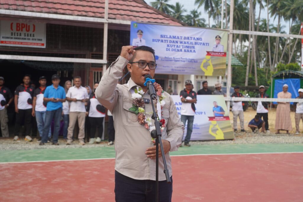 Wakil Bupati Mahyunadi saat memberikan sambutan di Turnamen Bola Voli Open Cup I di Lapangan Voli Desa Saka. Foto: Bagus/Pro Kutim