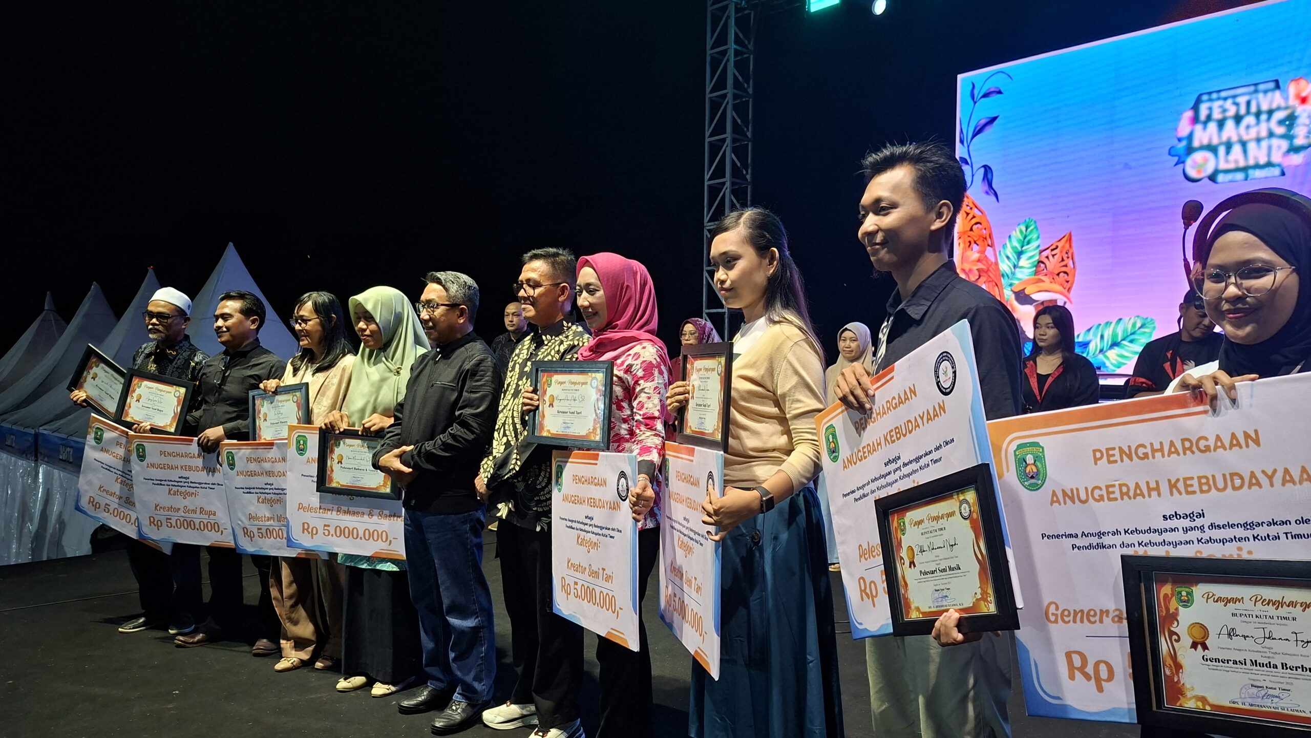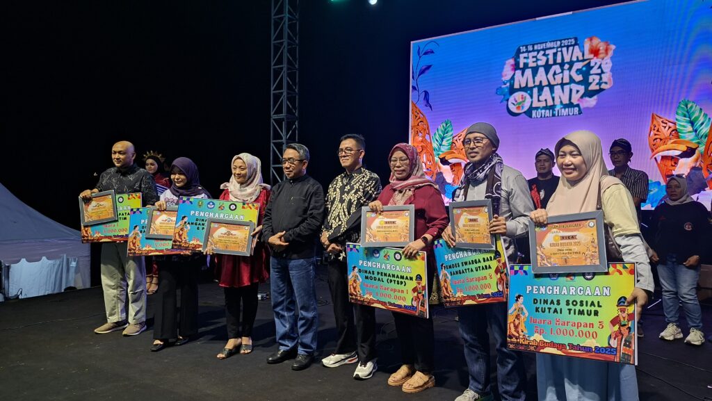 SANGATTA – Rangkaian malam kemeriahan Festival Magic Land Kutai Timur (Kutim) ke-2 Tahun 2025 yang digelar di Lapangan Polder Ilham Maulana pada Jumat (14/11/2025) malam berlangsung semarak. Ratusan penonton memenuhi area festival untuk menyaksikan pengumuman pemenang Lomba Kirab Budaya serta penerima Anugerah Kebudayaan Kutim Tahun 2025.