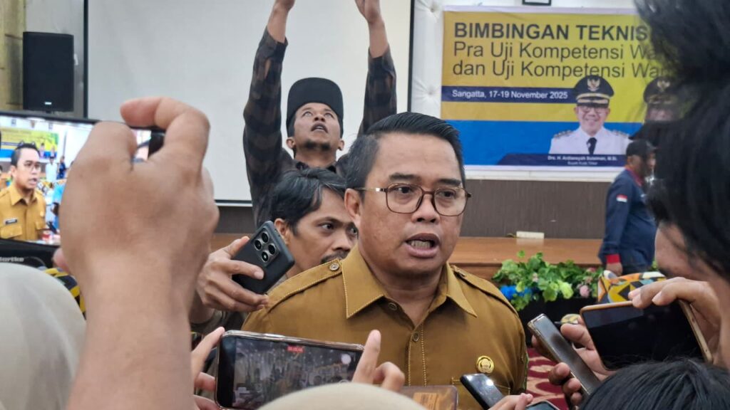 SANGATTA – Wakil Bupati Kutai Timur (Kutim) Mahyunadi menegaskan pentingnya peningkatan kualitas sumber daya manusia (SDM) di dunia pers saat ditemui awak media usai menghadiri kegiatan Uji Kompetensi Wartawan (UKW) XLI PWI Kutim bekerja sama dengan Diskominfo Staper Kutim, Selasa (18/11/2025) di D’Lounge Hotel Royal Victoria. Menurutnya, UKW merupakan langkah strategis untuk menciptakan insan pers yang semakin profesional, berkualitas, dan mampu memberikan kontribusi besar terhadap kemajuan bangsa.
