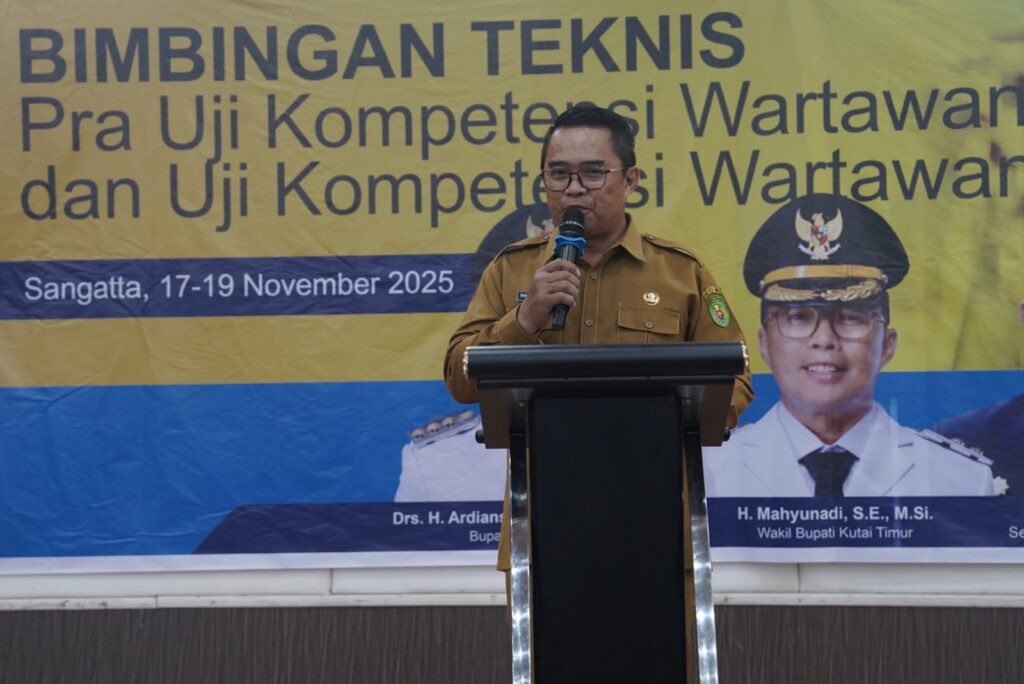 SANGATTA – Di bawah lampu-lampu Ballroom Hotel Royal Victoria, Sangatta Utara, Selasa (18/11/2025), nuansa kesungguhan terasa menyelimuti ruangan, ketika Uji Kompetensi Wartawan (UKW), garapan PWI Kutai Timur (Kutim) bekerja sama dengan Dinas Komunikasi Informatika Statistik dan Persandian (Diskominfo Staper) resmi dibuka. Wakil Bupati Kutim H Mahyunadi, mewakili Bupati H Ardiansyah Sulaiman, memulai agenda penting itu dengan sebuah pesan yang memuat ketegasan, harapan, dan pengingat bagi para jurnalis yang hadir.