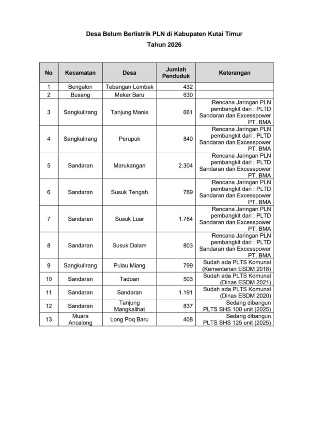 SANGATTA – Di antara lembah pedalaman dan pesisir yang berhadapan langsung dengan angin Laut Sulawesi, terselip deretan desa di Kutai Timur (Kutim) yang hingga kini belum menikmati aliran listrik PLN. Tahun perencanaan 2026 kembali menampilkan sebuah peta yang memperlihatkan kontras antara desa yang terang dan desa yang masih memandangi malam dengan penerangan terbatas. Sebanyak 13 desa tercatat sebagai wilayah yang belum teraliri listrik negara. Masing-masing membawa kisah geografis dan sosial yang berbeda.