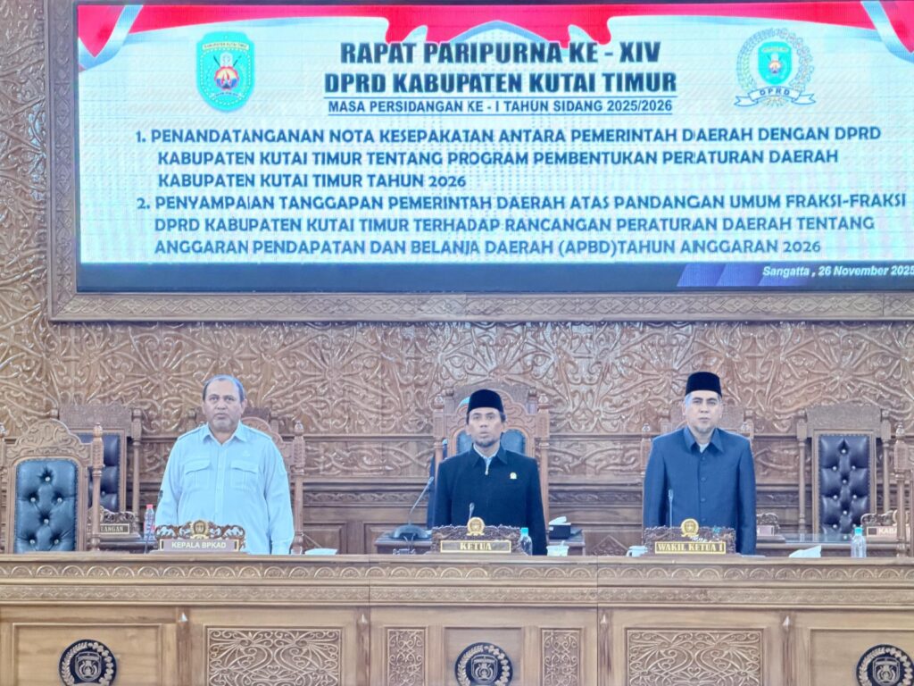 Pemerintah Kabupaten Kutim hadir diwakili Kepala Badan Pengelolaan Keuangan dan Aset Daerah (BPKAD) Ade Achmad Yulkafilah yang mewakili Bupati dan Wakil Bupati Kutim. Agenda utama rapat paripurna yakni Penandatanganan Nota Kesepakatan antara Pemerintah Daerah dan DPRD Kutai Timur tentang Program Pembentukan Peraturan Daerah (Propemperda) Tahun 2026.