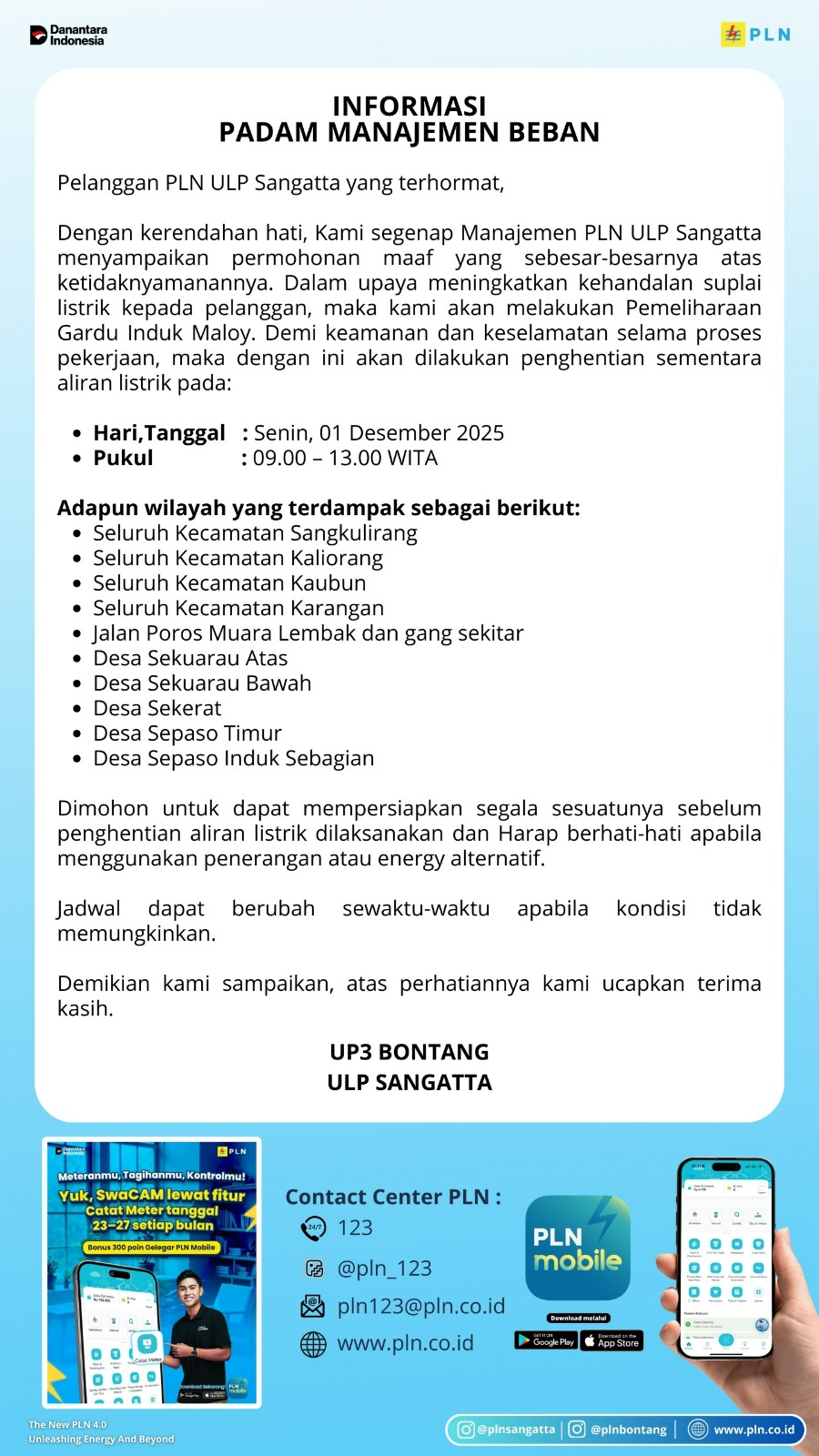 Di bagian akhir pengumuman, UP3 Bontang bersama ULP Sangatta menyampaikan terima kasih atas pengertian dan kerja sama pelanggan. Dengan memajukan tanggal pelaksanaan ke 1 Desember, PLN bermaksud menuntaskan pekerjaan dengan lebih cepat sekaligus meminimalkan risiko gangguan yang lebih panjang di kemudian hari.