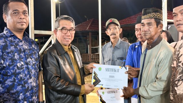 Penyerahan sertifikat dilakukan secara simbolis kepada Rudin, mewakili seluruh penerima manfaat, kemudian dilanjutkan dengan penyerahan kepada penerima lainnya satu per satu.