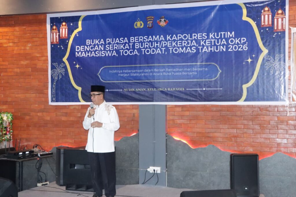 SANGATTA – Polres Kutai Timur (Kutim) menggelar kegiatan buka puasa bersama (Bukber) dengan serikat buruh, organisasi kepemudaan (OKP), mahasiswa, KNPI, tokoh adat, tokoh agama, serta tokoh masyarakat di Resto Hotel Zenova Royale, Teluk Lingga, Selasa (17/3/2026). Kegiatan tersebut turut dihadiri Bupati Kutim Ardiansyah Sulaiman.
