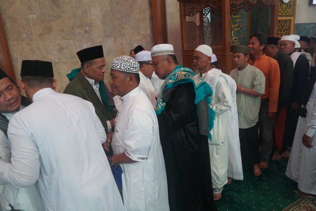 SANGATTA – Salat Idulfitri 1447 Hijriah di Masjid Agung Al Faruq Bukit Pelangi pada Sabtu (21/3/2026) berlangsung dengan khidmat, ditandai dengan membludaknya jemaah sejak pagi hari. Kendaraan jemaah bahkan memenuhi area parkir hingga meluber ke sisi jalan di sekitar masjid. Momentum hari kemenangan ini turut dihadiri oleh Bupati Kutai Timur (Kutim) Ardiansyah Sulaiman, bersama sang istri Siti Robiah dan keluarga.