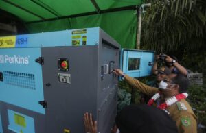 Plt Kasmidi Bulang saat momen peresmian lampu penerangan desa yang disupport oleh mesin genset berkekuatan 150 kVA. Foto: Irfan Pro Kutim