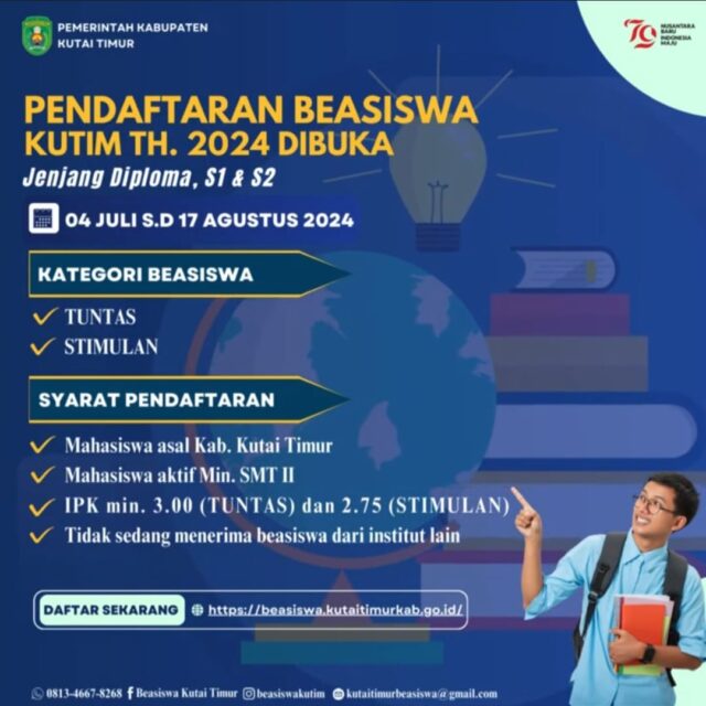 Pendaftaran Beasiswa Kutai Timur 2024 Foto: Ist SANGATTA- Kabar menggembirakan datang untuk mahasiswa asal Kutai Timur (Kutim). Pemerintah Kabupaten (Pemkab) Kutim melalui Bagian Kesejahteraan Rakyat (Kesra) telah resmi membuka pendaftaran beasiswa untuk jenjang Diploma, S1, dan S2 tahun 2024. Pendaftaran ini telah dibuka sejak 4 Juli dan akan berlangsung hingga 17 Agustus 2024. Terdapat dua kategori beasiswa yang ditawarkan, yaitu...